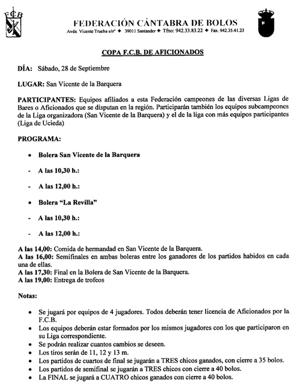 "El sábado 28 de septiembre en San Vicente de la Barquera se disputa la Copa de Aficionados de la FCB. Participarán los equipos afiliados a la Federación Cántabra y campeones de las diferentes ligas de aficionados de la región. Es necesaria la ficha federativa de todos los jugadores y la competición se juega de 11 a 13 metros." En lugar de unirnos las Federaciones se empeñan en separarnos. No está bien excluir a Ligas o sus equipos según sus fichas federativas o la falta de las mismas. No está bien que el Gobierno de la Región apoye tal disgregación. ¿No sería más justo que hiciesen una "Copa de Cantabria" entre todos los ganadores de las diferentes ligas de aficionados, con independencia de las Federaciónes?. Al menos participarían todos. Solo se necesitaria un criterio de unidad en las distancias, según el reglamento los concursos son de 13 y 14 metros y el corro libre de 12 a 16 metros, pero cada Liga y Federación hacen lo que les da la gana. |