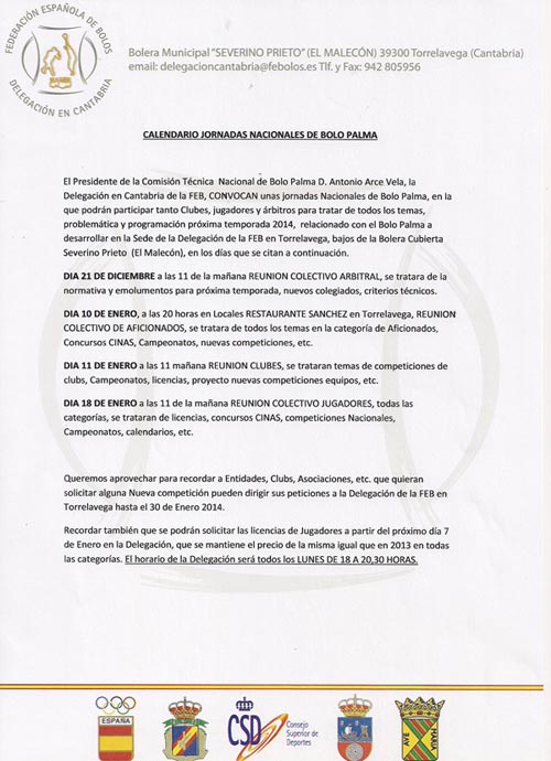 Si has sacado la Licencia Federativa podrás participar en los Concursos puntuables para el Campeonato de España de Aficionados 2014. A continuación un resumen de los concursos: Casa de los Bolos (5 al 12 de Mayo), Torrelavega y Sarón (19 al 26 de Mayo), Santillana y Llanda (2 al 9 de Junio), Cortiguera y Ganzo (13 al 21 de Junio), Puentenansa (27 al 4 de Julio), Rest. Sánchez y Ruiloba (11 al 18 de Julio), Sobarzo y La Patrona (30 al 6 de Agosto). Y Para el Campeonato de Parejas en Santillana (21 al 25 de Julio. |