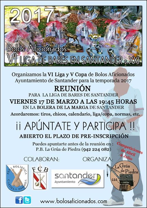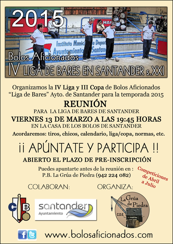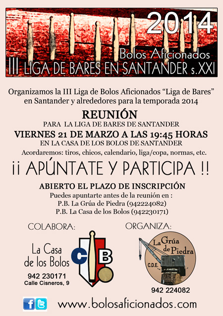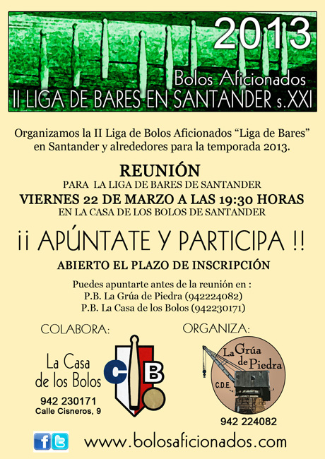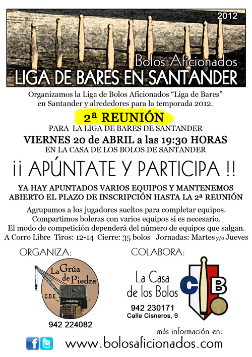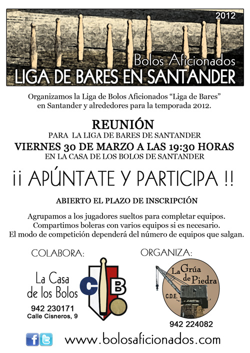 Se prepara la Liga de Aficionados en Santander para el 2012, la conocida como Liga de Bares. Organiza el club La Grúa de Piedra en colaboración con la Casa de los Bolos de Santander. Están invitados a participar cualquier equipo o peña de Santander y alrededores. Os mantendremos informados, pero si ya estás interesado en participar puedes ponerte en contacto con nosotros o en La Casa de los Bolos de Santander (Calle Cisneros). |