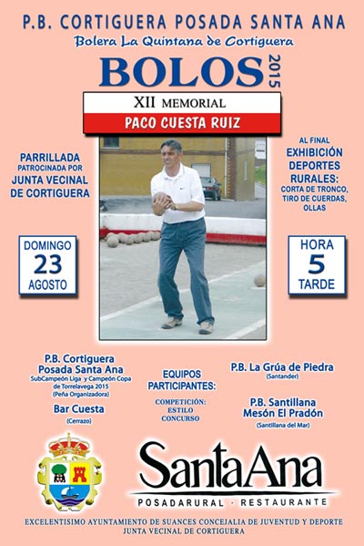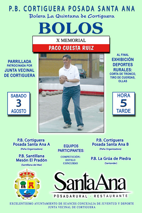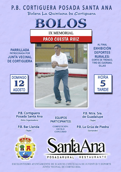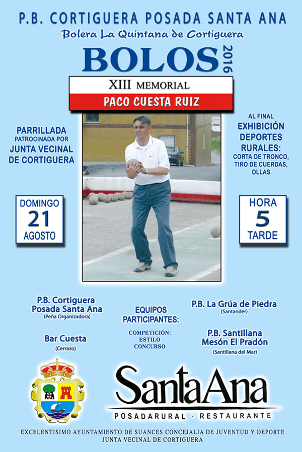 El domingo día 21 de agosto se celebra el XIII Memorial Paco Cuesta en Cortiguera, organizado por la P.B. Cortiguera Posada Santa Ana y en la que participarán a parte de la peña organizadora, la PB Santillana Mesón El Pradón, la PB La Grúa de Piedra de Santander (Campeón Liga de Bares de Santander) y El Bar Cuesta de Cerrazo. La competición será a estilo concurso y dará comienzo a las 5 de la tarde. Al finalizar el acto tendrá lugar una exhibición de deportes rurales y una parrillada. |