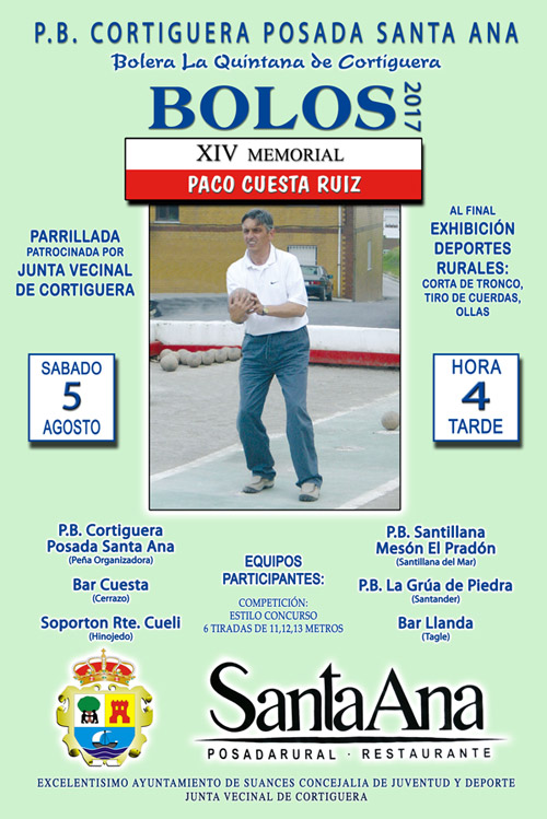 El sábado día 5 de agosto se celebra el XIV Memorial Paco Cuesta en Cortiguera, organizado por la P.B. Cortiguera Posada Santa Ana y en la que participarán a parte de la peña organizadora, la PB Santillana Mesón El Pradón, la PB La Grúa de Piedra de Santander, El Bar Cuesta de Cerrazo, Soportón Rte. Cueli de Hinojedo y Bar Llanda de Tagle. La competición será a estilo concurso, con 6 tiradas de 11,12 y 13 metros y dará comienzo a las 4 de la tarde. Al finalizar el acto tendrá lugar una exhibición de deportes rurales y una parrillada. |