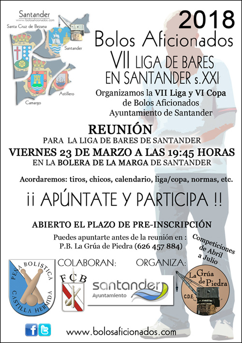El viernes día 30 de MARZO a las 19:30 horas, tendrá lugar la REUNIÓN para la Liga de Aficionados de Santander. Dicha reunión será en la sede de la Casa de los Bolos de Santander (calle Cisneros número 9). Se agruparán a los jugadores sueltos para completar equipos, se compartirán boleras con varios equipos si es necesario y el modo de competición dependerá del número de equipos que salgan. La P.B. La Grúa de Piedra es la encargada de la organización de la Liga de Bares para Santander. Puedes ver el cartel anunciador. |